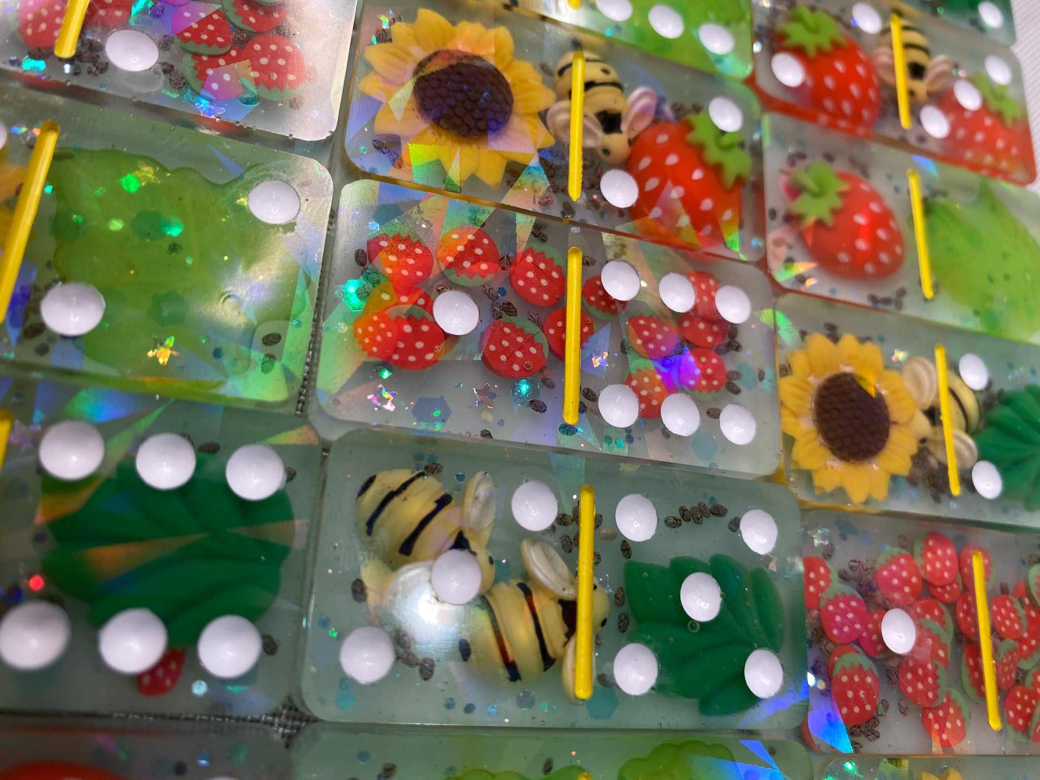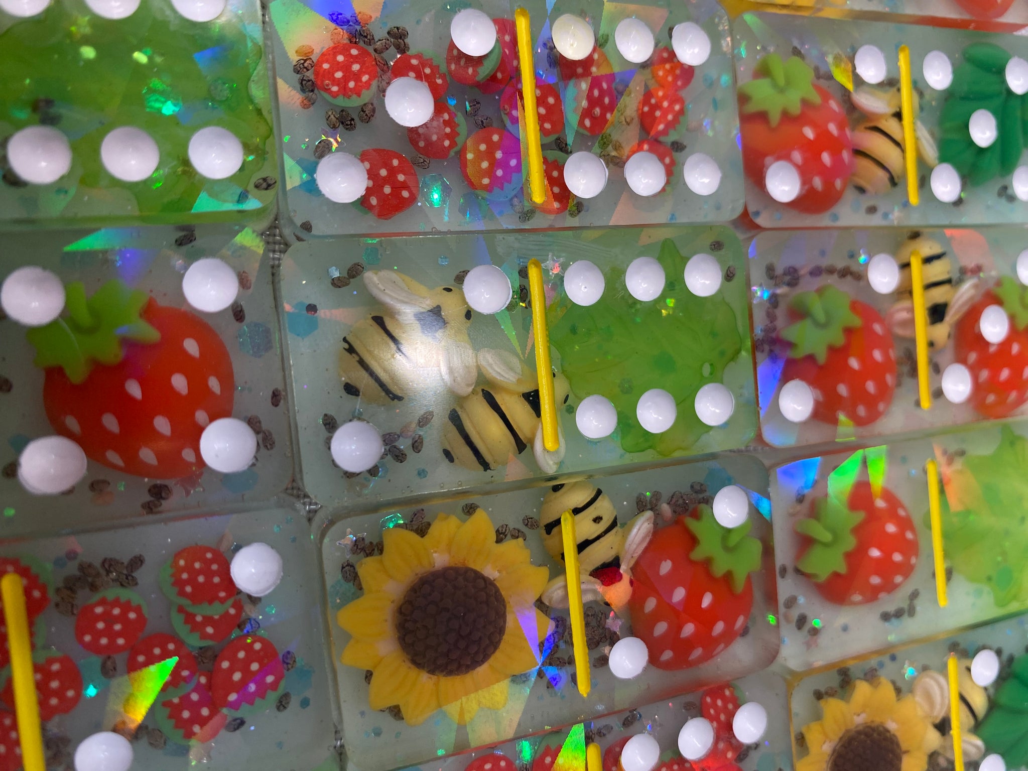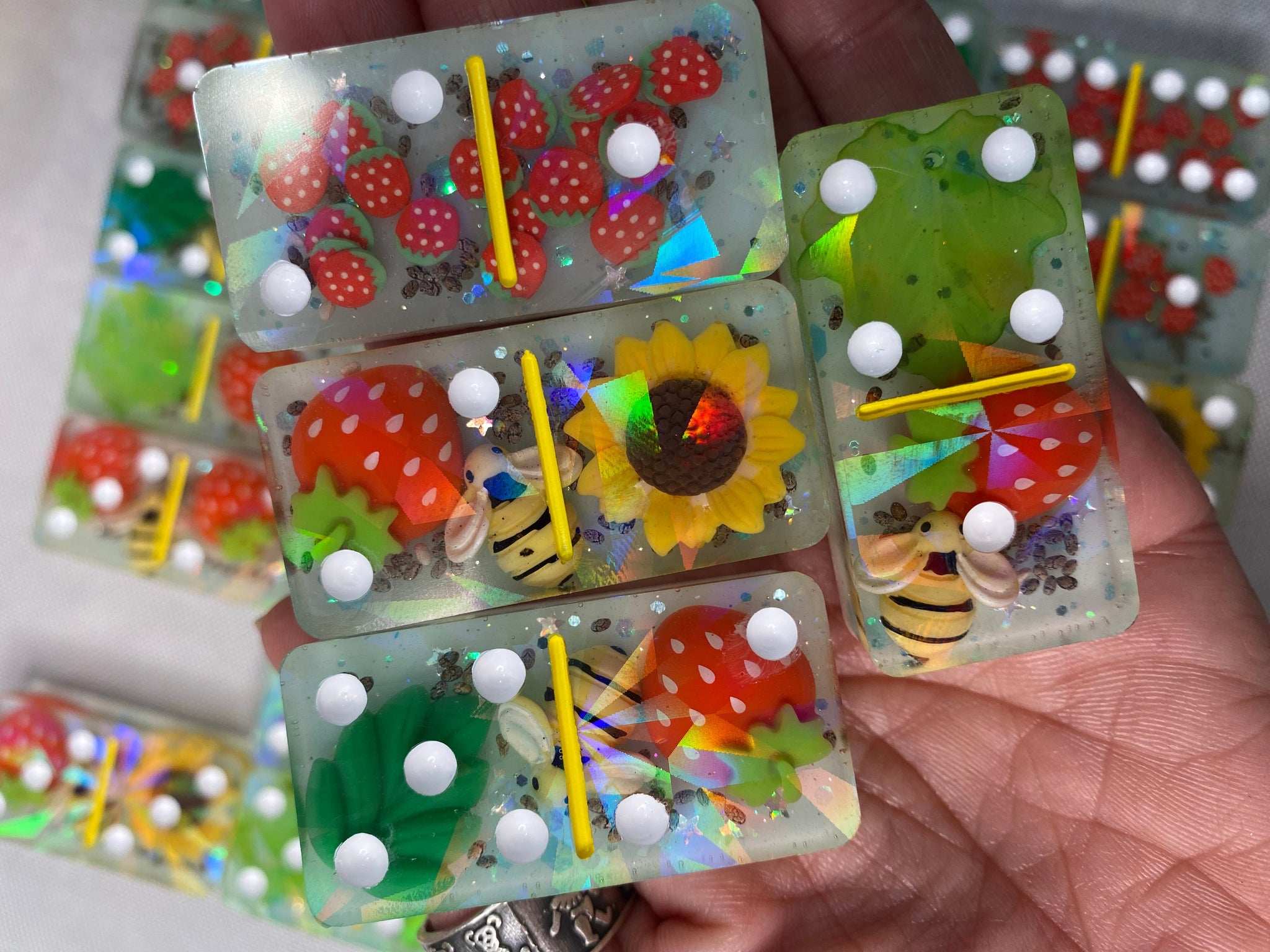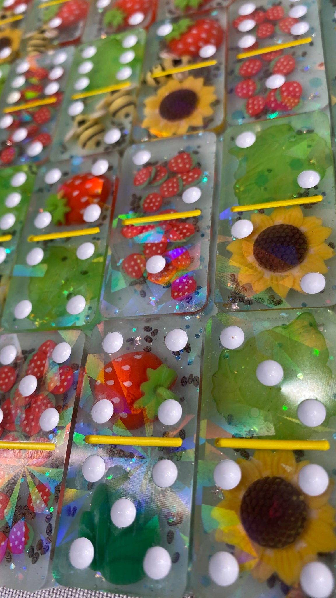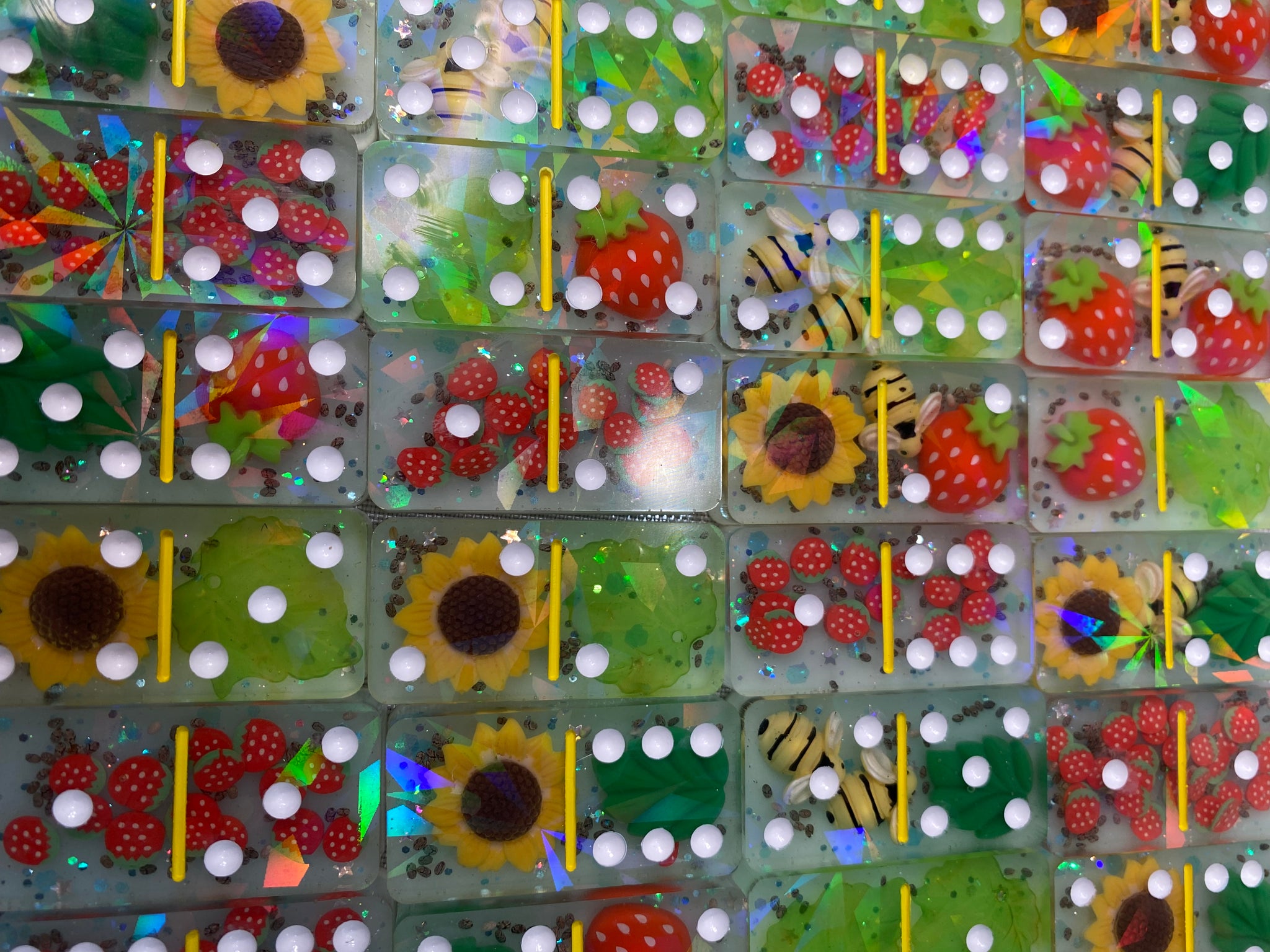 Double 6 Strawberry, Sunflower, Bee theme holographic domino set. Comes with 28 pieces.Â